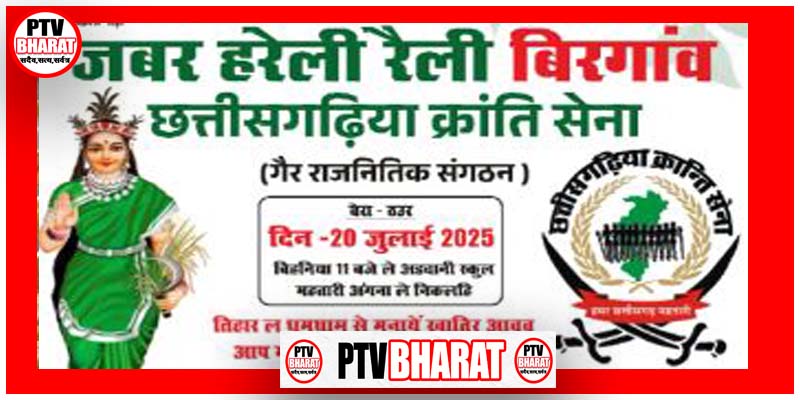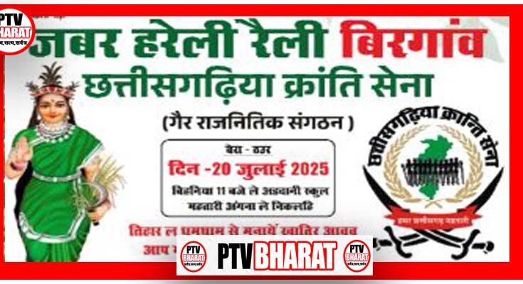 PTV BHARAT छत्तीसगढ़ की सांस्कृतिक पहचान और गौरव को जनमानस तक पहुंचाने तथा पारंपरिक विरासत को जीवित रखने के उद्देश्य से छत्तीसगढ़िया क्रांति सेना द्वारा एक भव्य “जबर हरेली रैली” का आयोजन किया जा रहा है। यह आयोजन 20 जुलाई 2025, दिन रविवार को बिरगांव स्थित अडवाणी स्कूल, छत्तीसगढ़ महतारी मूर्ति के पास से सुबह 11 बजे प्रारंभ होकर महतारी आंगन तक निकलेगा। यह आयोजन पूरी तरह गैर राजनीतिक स्वरूप में, जनभावनाओं के अनुरूप किया जा रहा है।