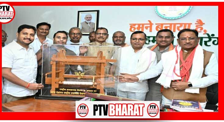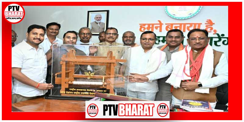 PTV BHARAT 07 AUGUST 2025 रायपुर, 07 अगस्त 2025/ राष्ट्रीय हथकरघा दिवस के अवसर पर छत्तीसगढ़ बुनकर समाज के प्रतिनिधिमंडल ने राजधानी रायपुर स्थित मुख्यमंत्री निवास कार्यालय में मुख्यमंत्री श्री विष्णु देव साय से सौजन्य भेंट की।