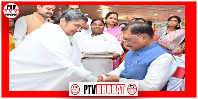 PTV BHARAT 08 AUGUST 2025 रायपुर, 08 अगस्त 2025/ रक्षाबंधन के शुभ अवसर पर प्रजापिता ब्रह्मकुमारी ईश्वरीय विश्वविद्यालय, रायपुर की संचालिका ब्रह्मकुमारी सविता बहन ने मुख्यमंत्री श्री विष्णु देव साय से उनके निवास कार्यालय में सौजन्य भेंट की और उन्हें रक्षा-सूत्र बाँधकर उनके स्वास्थ्य, दीर्घायु और सुखद जीवन की मंगलकामना की।