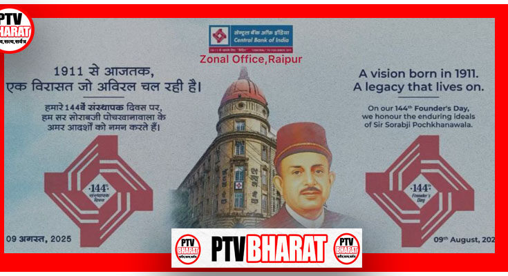 PTV BHARAT 10 AUGUST 2025 रायपुर, 09 अगस्त 2025 — सेंट्रल बैंक ऑफ इंडिया, आंचलिक एवं क्षेत्रीय कार्यालय रायपुर द्वारा बैंक के संस्थापक सर सोराबजी पोचखानावाला की 114वीं जयंती के अवसर पर “संस्थापक दिवस” का आयोजन गरिमापूर्ण एवं प्रेरणादायी वातावरण में किया गया। इस अवसर का उद्देश्य संस्थापक के आदर्शों, दूरदर्शिता, मूल्यों एवं बैंकिंग क्षेत्र में उनके अद्वितीय योगदान को स्मरण करना और उनसे प्रेरणा ग्रहण करना रहा।