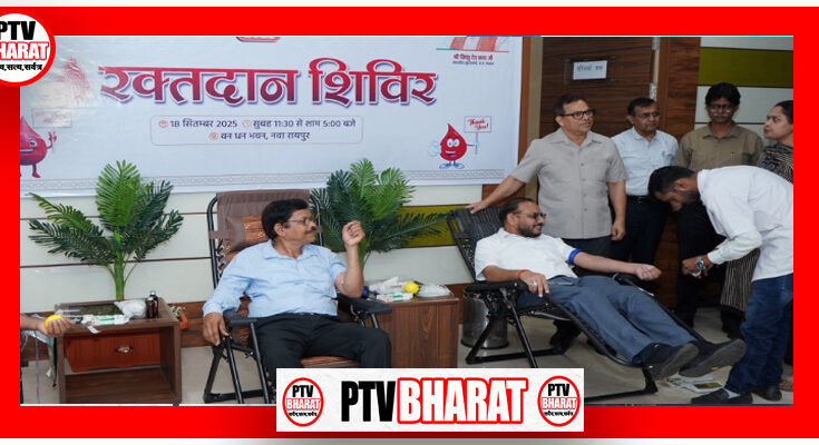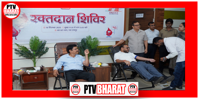 PTV BHARAT 18 SEPT 2025 रायपुर – सेवा पखवाड़ा 2025 के अंतर्गत आज छत्तीसगढ़ राज्य लघु वनोपज संघ, मुख्यालय वनधन भवन, सेक्टर-24, नवा रायपुर में एक दिवसीय रक्तदान शिविर का आयोजन किया गया। यह शिविर सुबह 11.30 बजे से शाम 5 बजे तक आयोजित हुआ। यह आयोजन सेवा पखवाड़ा के तहत मानव सेवा और सामाजिक योगदान का एक प्रेरणादायक उदाहरण बना। इस शिविर में वनोपज संघ के अधिकारियों और कर्मचारियों ने बढ़-चढ़कर भाग लिया और लगभग 40 यूनिट रक्त स्वेच्छा से दान किया। खास बात यह रही कि इस शिविर में महिलाओं की भागीदारी भी उल्लेखनीय रही। यह आयोजन लघु वनोपज संघ के प्रबंध संचालक श्री अनिल कुमार साहू के मार्गदर्शन में किया गया। उन्होंने भी रक्तदान कर दूसरों को प्रेरित किया। शिविर के दौरान स्वास्थ्य विभाग की टीम ने सभी चिकित्सीय नियमों का पालन करते हुए रक्त संग्रहण किया। इस अवसर पर सभी उपस्थित अधिकारियों और कर्मचारियों ने नियमित रूप से रक्तदान करने का संकल्प लिया। प्रबंध संचालक साहू ने भविष्य में भी ऐसे सामाजिक और जनहित के कार्यों को नियमित रूप से आयोजित करने की घोषणा की। कार्यक्रम के अंत में प्रबंध संचालक अनिल कुमार साहू ने सभी रक्तदाताओं को प्रमाण-पत्र और उपहार देकर सम्मानित किया गया।