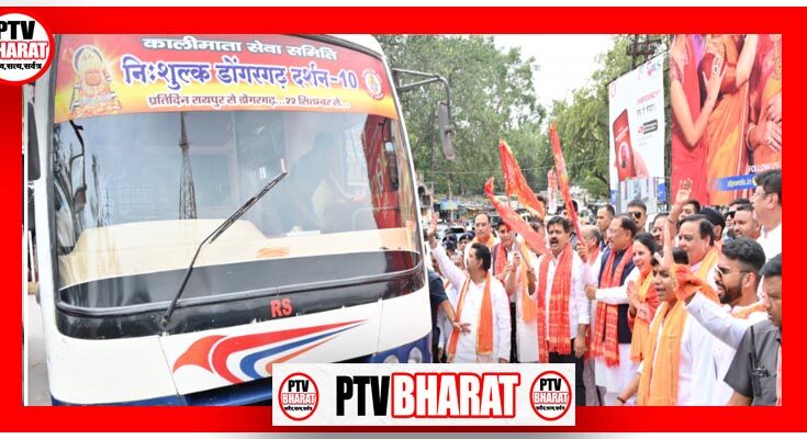 PTV BHARAT 23 SEPT 2025 रायपुर। मुख्यमंत्री विष्णु देव साय ने आज रायपुर शहर के आकाशवाणी चौक स्थित माँ काली मंदिर से डोंगरगढ़ तक निःशुल्क बस सेवा का शुभारंभ किया। रायपुर से माँ बम्लेश्वरी के दर्शन के लिए डोंगरगढ़ जाने वाले श्रद्धालुओं को इस बस सेवा का नि:शुल्क लाभ मिलेगा। इस अवसर पर मुख्यमंत्री साय ने कालीमाता सेवा समिति की इस पहल की सराहना करते हुए समिति के पदाधिकारियों को बधाई एवं शुभकामनाएँ दीं। उन्होंने माँ काली और माँ बम्लेश्वरी से छत्तीसगढ़ में खुशहाली, समृद्धि और शांति की कामना की। साथ ही सभी प्रदेशवासियों को शारदीय नवरात्र की हार्दिक बधाई और शुभकामनाएँ भी प्रेषित कीं।