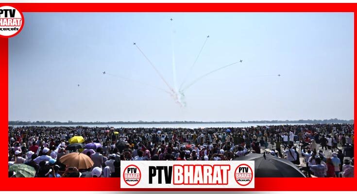PTV BHARAT 05 NOV 2025 छत्तीसगढ़ राज्य स्थापना की 25वीं वर्षगांठ पर आज नवा रायपुर के सेंध जलाशय के ऊपर भारतीय वायु सेना की प्रतिष्ठित एरोबेटिक “सूर्यकिरण” की टीम ने रोमांचक एयर शो का प्रदर्शन किया। देश के उप राष्ट्रपति सी.पी. राधाकृष्णन, राज्यपाल श्री रमेन डेका, मुख्यमंत्री विष्णु देव साय और विधानसभा अध्यक्ष डॉ. रमन सिंह के साथ हजारों लोगों ने अद्भूत और रोमांचक एयर शो का आनंद लिया। आज प्रदेशवासियों के लिए वायु सेना का एयर शो कमाल का अनुभव रहा। सेंध जलाशय के ऊपर वायु सेना के फाइटर प्लेन्स ने एक के बाद एक कई हवाई करतब दिखाए। आसमान में पंछियों के झुंड की तरह बिल्कुल क्रम से उड़ने वाले फाइटर प्लेन्स के माध्यम से वायु सेना के जाबांजों ने अपने नियंत्रण और शौर्य का अद्भुत प्रदर्शन किया। विमानों के माध्यम से जब आकाश में तिरंगा लहराया तो सेंध जलाशय भारत माता की जय के नारे से गूंज उठा।