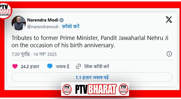 PTV BHARAT 14 NOVEMBER 2025 एजेंसी नई दिल्ली। भारत के पहले प्रधानमंत्री जवाहरलाल नेहरू की जंयती पर प्रधानमंत्री नरेंद्र मोदी ने उन्हें श्रद्धांजलि अर्पित की है। पीएम मोदी ने सोशल मीडिया प्लेटफॉर्म एक्स पर पोस्ट शेयर करते हुए पंडित नेहरू के बारे में लिखा है। पीएम मोदी ने एक्स पर लिखा, “पूर्व प्रधानमंत्री पंडित जवाहरलाल नेहरू को उनकी जयंती के मौके पर श्रद्धांजलि अर्पित करता हूं।”