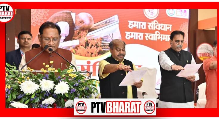 PTV BHARAT 26 NOV 2025 मुख्यमंत्री विष्णु देव साय आज 75वें संविधान दिवस के अवसर पर राजधानी रायपुर स्थित टाउन हॉल में आयोजित “हमारा संविधान, हमारा स्वाभिमान” कार्यक्रम में शामिल हुए। मुख्यमंत्री साय ने उपस्थित जनसमूह के साथ संविधान की प्रस्तावना का सामूहिक वाचन किया और संविधान के प्रति अपनी निष्ठा व्यक्त की। इस दौरान मुख्यमंत्री ने संविधान दिवस पर आयोजित प्रदर्शनी का अवलोकन किया। उन्होंने संविधान पर आधारित लघु फिल्म भी देखी और जनप्रतिनिधियों के साथ इस अवसर को यादगार बनाने के लिए सेल्फी ली।मुख्यमंत्री साय ने कहा कि विश्व का सबसे बड़ा लोकतंत्र भारत सदैव संविधान में आस्था रखते हुए आगे बढ़ रहा है। संविधान प्रत्येक नागरिक को स्वतंत्रता के साथ अपनी बात रखने का अधिकार देता है और अभिव्यक्ति की स्वतंत्रता सुनिश्चित करता है। उन्होंने कहा कि विधायक और सांसद जैसे पदों पर आम नागरिकों का पहुँचना संविधान की ही उदार, समावेशी और लोकतांत्रिक व्यवस्था का परिणाम है।
