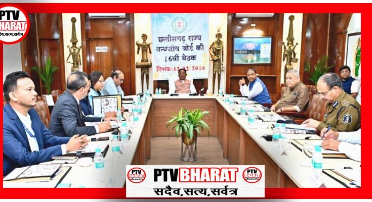 PTV BHARAT 13 FEBRUARY 2026 रायपुर। मुख्यमंत्री विष्णु देव साय की अध्यक्षता में आज मुख्यमंत्री निवास कार्यालय में छत्तीसगढ़ राज्य वन्यजीव बोर्ड की 16वीं बैठक आयोजित हुई। बैठक में बोर्ड की 15वीं बैठक के पालन प्रतिवेदन तथा नवीन एजेंडों पर चर्चा उपरांत प्रस्तावों को राष्ट्रीय वन्यजीव बोर्ड के निर्णय हेतु प्रेषित करने पर सहमति बनी।मुख्यमंत्री साय ने कहा कि वन्यजीव हमारी प्रकृति की अमूल्य धरोहर हैं और उनके संरक्षण–संवर्धन के लिए सामूहिक प्रयास आवश्यक हैं। उन्होंने वन्यजीवों की सुरक्षा के लिए सतत निगरानी, अवैध गतिविधियों पर रोक तथा उनकी सुरक्षा के लिए जनभागीदारी को बढ़ावा देने पर जोर दिया। साथ ही, वनों के आसपास रहने वाले ग्रामीणों में जागरूकता बढ़ाने और युवाओं की सक्रिय भूमिका सुनिश्चित करने की आवश्यकता बताई। मुख्यमंत्री ने न्यूनतम हस्तक्षेप के सिद्धांत को अपनाते हुए अत्यावश्यक कार्यों को ही वन्यजीवों के प्राकृतिक आवास में बिना किसी छेड़छाड़ के पूर्ण करने पर बल दिया। उन्होंने सह-अस्तित्व के सिद्धांतों के अनुरूप सभी गतिविधियों के संचालन की बात कही।बैठक में छत्तीसगढ़ राज्य वन्यजीव बोर्ड की स्थायी समिति (Standing Committee of State Board for Wildlife) के गठन को मंजूरी दी गई। स्थायी समिति का गठन वन एवं जलवायु परिवर्तन मंत्री की अध्यक्षता में किया जाएगा, जिसमें 11 अन्य सदस्य शामिल होंगे। उल्लेखनीय है कि वन्य प्राणियों की दृष्टि से महत्वपूर्ण क्षेत्रों में होने वाले कार्यों के प्रस्तावों पर राज्य वन्यजीव बोर्ड का अभिमत अनिवार्य होता है। बोर्ड की बैठकों के बीच अधिक अंतराल के कारण प्रस्तावों की स्वीकृति में विलंब की स्थिति बनती है। स्थायी समिति के गठन से वैधानिक मंजूरियों के त्वरित निपटान तथा वन्यजीव प्रबंधन से संबंधित मुद्दों के शीघ्र निराकरण में सहायता मिलेगी।